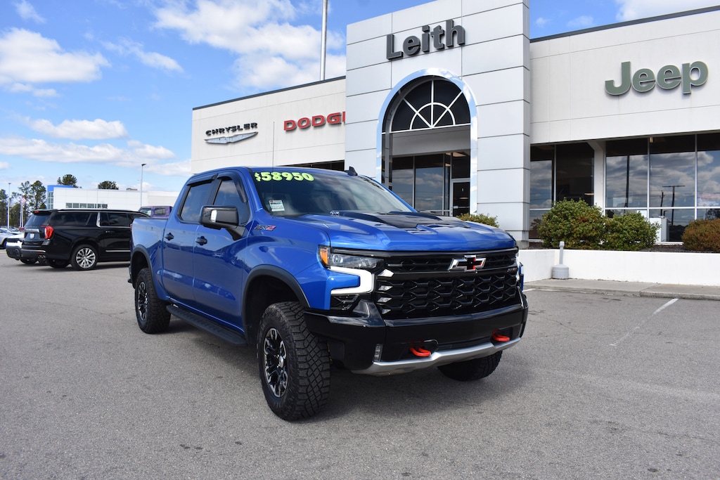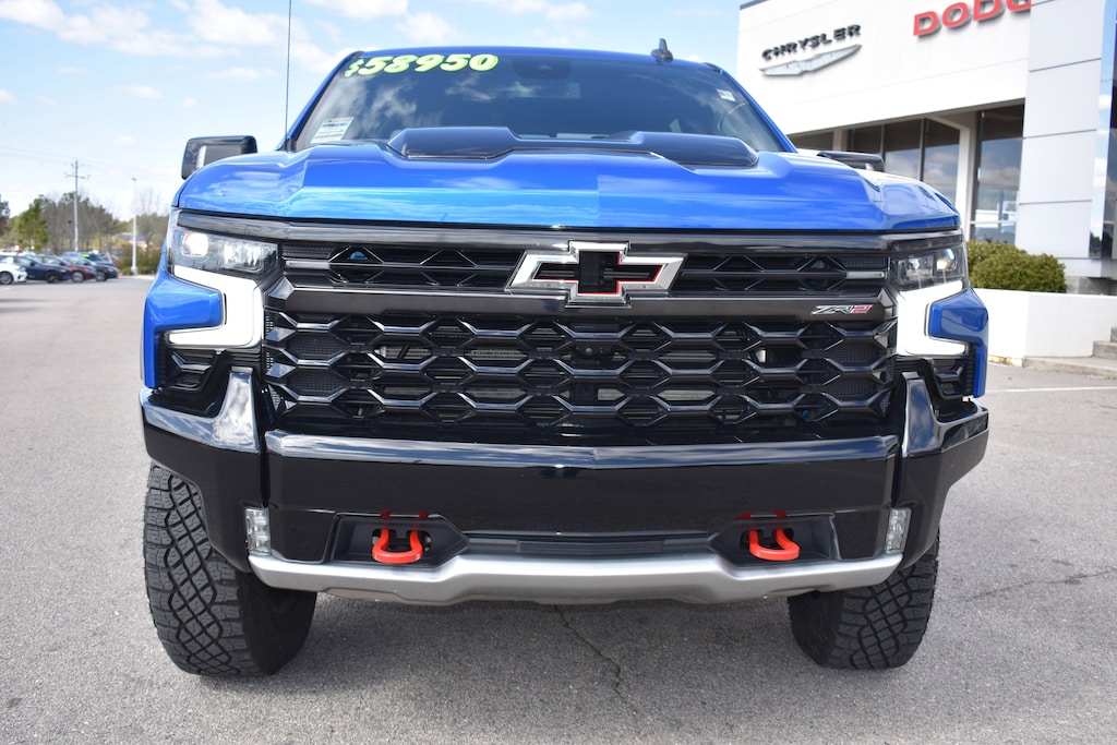 Clean CARFAX. Glacier Blue Metallic 2023 Chevrolet Silverado 1500 ZR2 4WD 10-Speed Automatic EcoTec3 6.2L V8 10-Way Power Driver Seat w/Lumbar, 10-Way Power Passenger Seat Adjuster w/Lumbar, 12.3" Multicolor Reconfigurable Digital Display, 120-Volt Bed Mounted Power Outlet, 120-Volt Instrument Panel Power Outlet, 170 Amp Alternator, 2 USB Data Ports, 2nd Row Heated Outboard Seats, 3.23 Rear Axle Ratio, 4-Wheel Disc Brakes, 7 Speakers, ABS brakes, Air Conditioning, All-Weather Floor Liner (LPO), Alloy wheels, AM/FM radio: SiriusXM with 360L, Apple CarPlay/Android Auto, Assist Step & Tonneau Package III (LPO), Auto High-beam Headlights, Auto-dimming door mirrors, Auto-Dimming Inside Rear-View Mirror, Auto-dimming Rear-View mirror, Auto-Locking Rear Differential, Automatic Emergency Braking, Automatic temperature control, Bed View Camera, Bluetooth® For Phone, Brake assist, Chevrolet Connected Access Capable, Chevytec Spray-On Black Bedliner, Color-Keyed Carpeting Floor Covering, Compass, Deep-Tinted Glass, Delay-off headlights, Driver Memory, Dual Exhaust, Dual front impact airbags, Dual front side impact airbags, Dual Rear USB Ports (Charge Only), Electric Rear-Window Defogger, Electrical Steering Column Lock, Electronic Cruise Control, Electronic Stability Control, Electronic Transmission Range Selector Shifter, EZ Lift Power Lock & Release Tailgate, Floor Mounted Center Console, Following Distance Indicator, Forward Collision Alert, Front anti-roll bar, Front dual zone A/C, Front fog lights, Front LED Fog Lamps, Front Pedestrian Braking, Front Rainsensing Wipers, Front reading lights, Front wheel independent suspension, Fully automatic headlights, Garage door transmitter, Hard-Folding Tonneau Cover (LPO), HD Surround Vision, Heated door mirrors, Heated Driver & Front Outboard Passenger Seats, Heated front seats, Heated rear seats, Heated Steering Wheel, Heated steering wheel, Heavy-Duty Air Filter, High Gloss Black Mirror Caps, Hill Descent Control, Hitch Guidance, Hitch Guidance w/Hitch View, Illuminated entry, Integrated Trailer Brake Controller, IntelliBeam Automatic High Beam On/Off, Keyless Open & Start, Lane Keep Assist w/Lane Departure Warning, LED Cargo Area Lighting, Low tire pressure warning, Manual Tilt/Telescoping Steering Column, Memory seat, Multi-Flex Tailgate, Not Equipped w/Steering Column Lock, Occupant sensing airbag, Off-Road High Clearance Steps (LPO), OnStar & Chevrolet Connected Services Capable, Outside Heated Power-Adjustable Mirrors, Outside temperature display, Overhead airbag, Panic alarm, Perforated Leather Seat Trim, Performance Red Recovery Hooks, Perimeter Lighting, Power door mirrors, Power driver seat, Power Front Passenger Windows w/Express Up/Down, Power Front Windows w/Driver Express Up/Down, Power passenger seat, Power Rear Windows w/Express Down, Power Sliding Rear Window w/Rear Defogger, Power steering, Power Sunroof, Power windows, Preferred Equipment Group 3LT, Premium audio system: Chevrolet Infotainment 3 Premium, Premium Bose 7-Speaker Sound System, Radio data system, Radio: Chevrolet Infotainment 3 Premium System, Rain sensing wipers, Rear Cross Traffic Alert-Braking, Rear Park Assist, Rear Parking Sensors, Rear Pedestrian Alert, Rear reading lights, Rear seat center armrest, Rear step bumper, Rear Wheelhouse Liners, Rear window defroster, Remote keyless entry, Remote Vehicle Starter System, Safety Alert Seat, Security system, SiriusXM w/360L, Speed control, Speed-sensing steering, Split folding rear seat, Standard Tailgate, Steering Wheel Audio Controls, Steering wheel mounted audio controls, Tachometer, Telescoping steering wheel, Theft Deterrent System (Unauthorized Entry), Tilt steering wheel, Traction control, Trailer Camera Provisions, Trailer Side Blind Zone Alert, Trailering App, Trailering Package, Trip computer, Underseat Storage (LPO), Universal Home Remote, Up-Level Rear Seat w/Storage Package, Variably intermittent wipers, Ventilated Driver & Front Passenger Seats, V