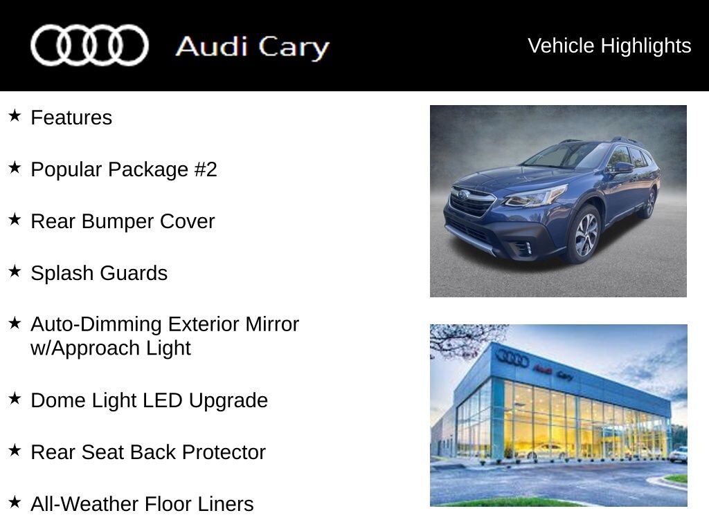 Abyss Blue Pearl 2020 Subaru Outback Limited CVT Lineartronic 2.5L 4-Cylinder DOHC 16V AWD Features, All-Weather Floor Liners, Auto-Dimming Exterior Mirror w/Approach Light, Dome Light LED Upgrade, Popular Package #2, Rear Bumper Cover, Rear Seat Back Protector, Splash Guards.